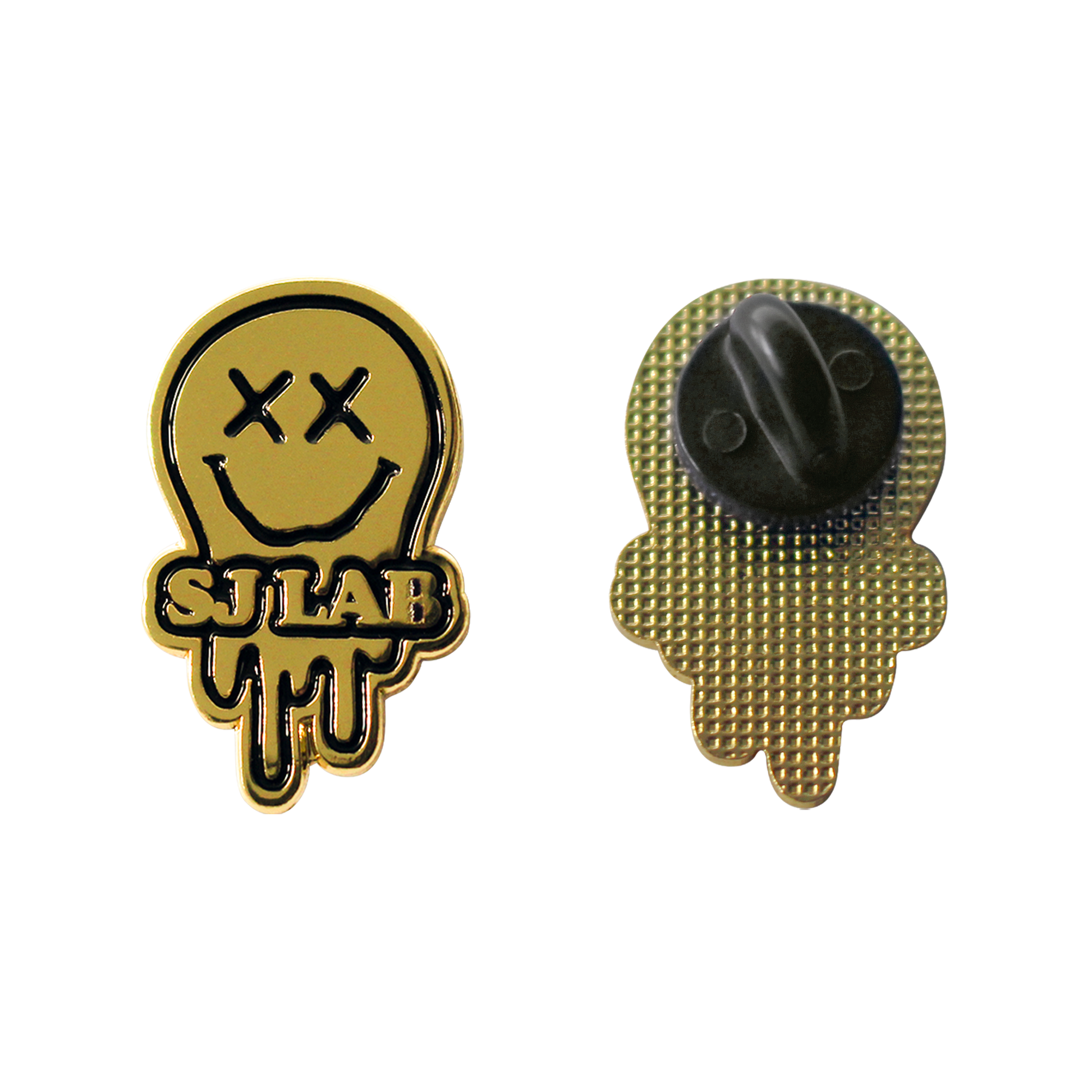 - Signature gold-tone SJ LAB melting face pin—detachable for versatile styling